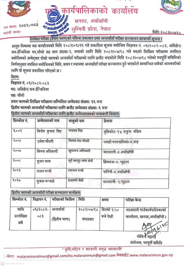 लिखित परीक्षा (प्रथम चरण) को नतिजा प्रकाशन तथा अन्तर्वार्ता परीक्षा सञ्चालन सम्बन्धी सूचना ।