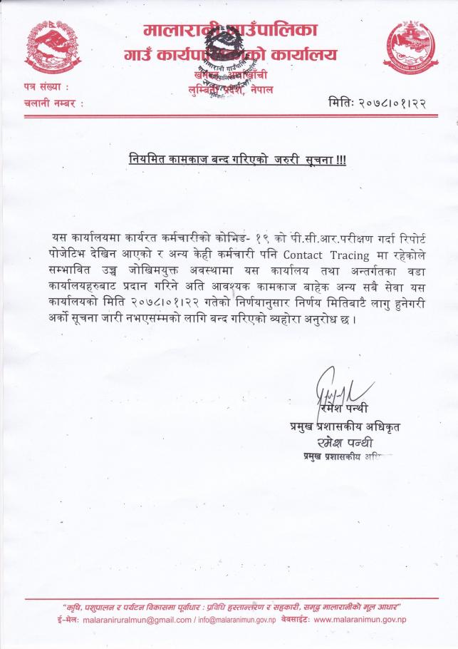 नियमित कामकाज बन्द गरिएको जरुरी सूचना ।