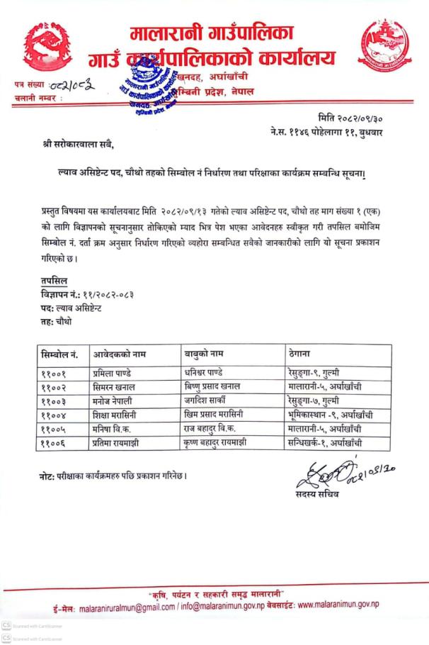 ल्याव असिस्टेन्ट पद, चौथो तहको सिम्वोल नं निर्धारण तथा परीक्षा कार्यक्रम सम्बन्धि सूचना ।