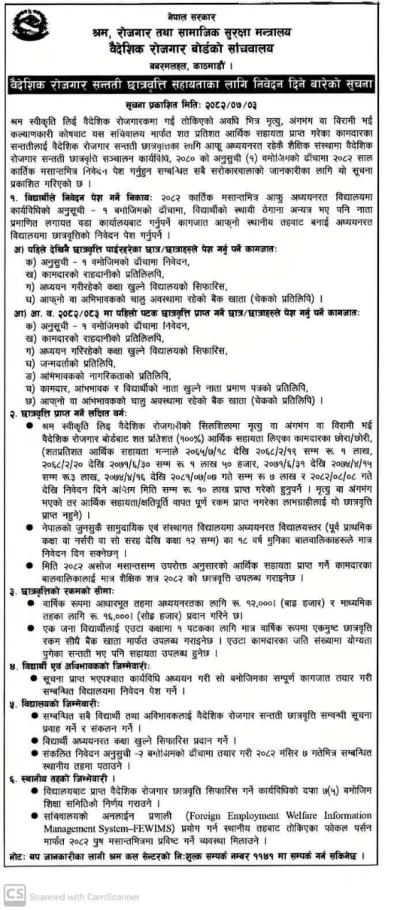 वैदेशिक रोजगार सन्तती छात्रवृति सहायताका लागि निबेदन दिने बारेको सूचना