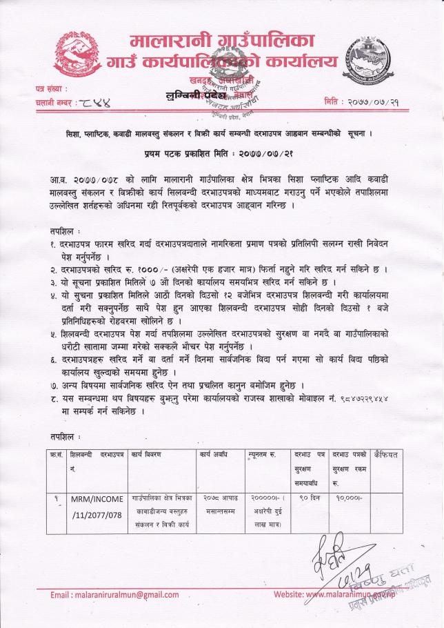 सिशा, प्लाष्टिक, कवाडी मालवस्तु संकलन र विक्री कार्य सम्बन्धी दरभाउपत्र आह्वान सम्बन्धीको सूचना !!