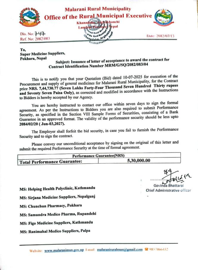 letter of acceptance for tender no 4 general Medicine .