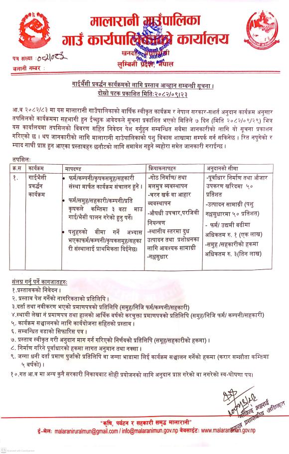 गाईभैंसी प्रवर्द्धन कार्यक्रमको लागि प्रस्ताव आव्हान सम्बन्धी सूचना ।
